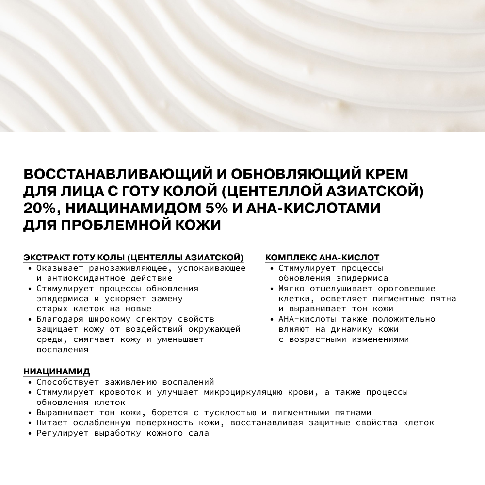 СохранитьВосстанавливающий и обновляющий крем для лица с готу колой (центеллой азиатской) 20 %, ниацинамидом 5 % и AHA-кислотами для проблемной кожи GotuKola 20% + Niacinamide 5% 50 мл интересное:
