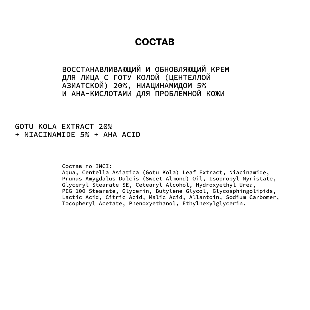 Купить Восстанавливающий и обновляющий крем для лица с готу колой (центеллой азиатской) 20 %, ниацинамидом 5 % и AHA-кислотами для проблемной кожи GotuKola 20% + Niacinamide 5% 50 мл