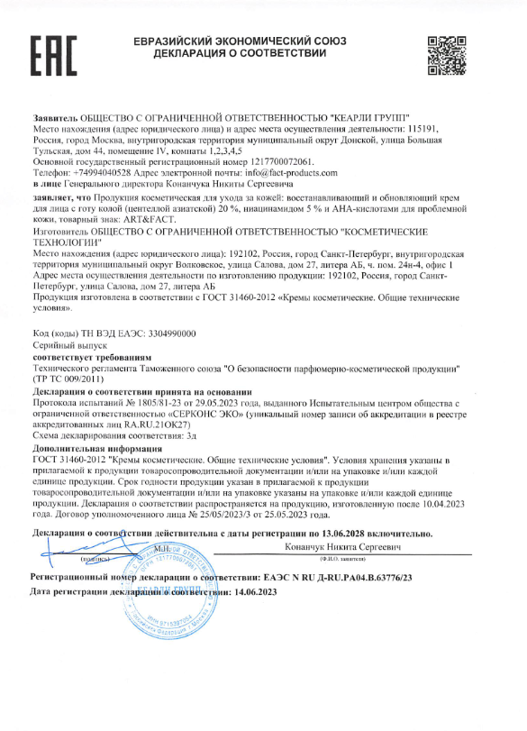 ART&FACT. / Восстанавливающий и обновляющий крем для ухода за кожей лица с готу колой и ниацинамидом, 50 мл