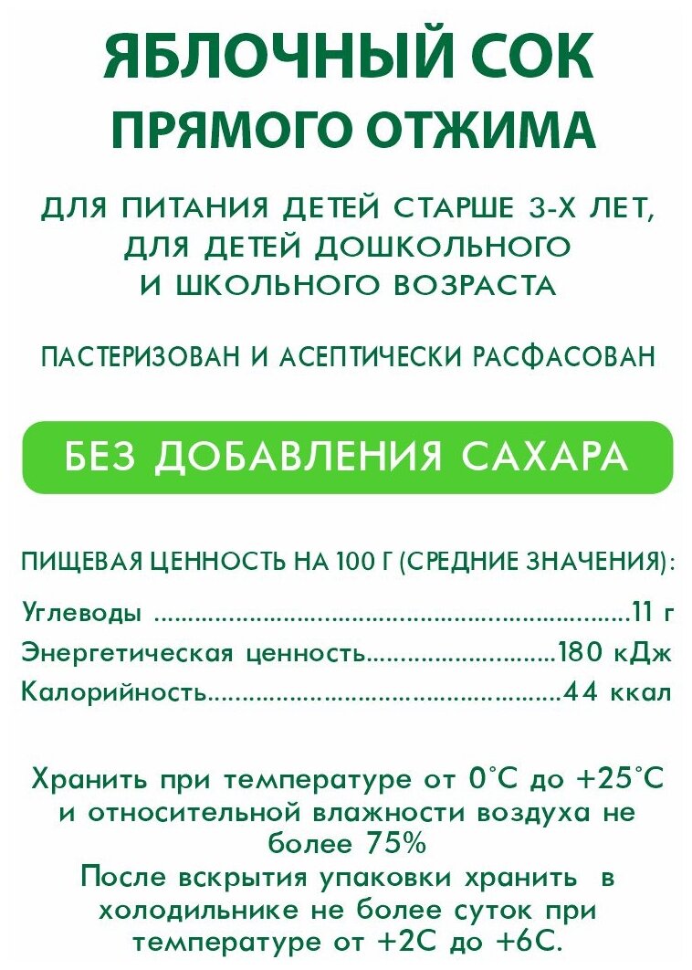 | Дополнительная информация | содержит сахара природного (естественного) происхождения, стерилизован и асептически расфасован; хранить при температуре от 0 °C до 25 °С и относительной влажности воздуха не более 75 %, после вскрытия упаковки хранить в холодильнике не более суток при температуре от 2 °С до 6 °C; с винтовой крышкой |