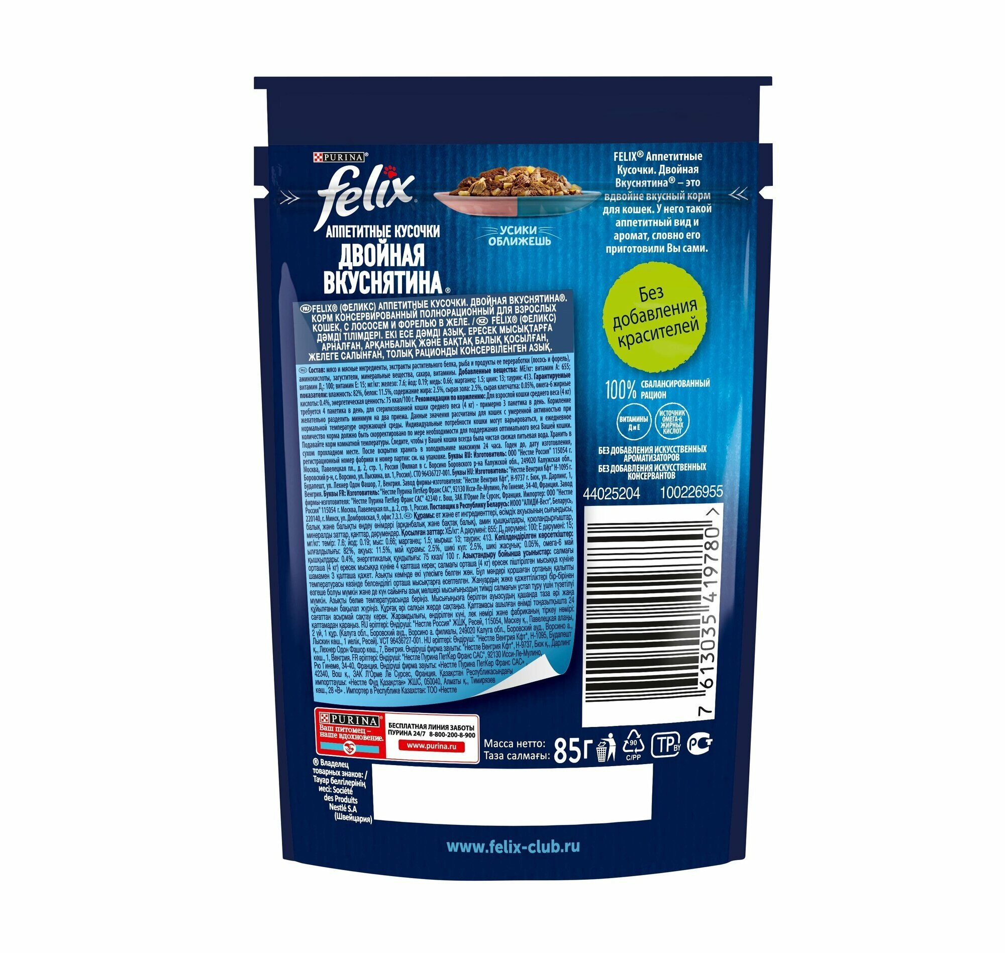 Ниже Вы можете прочитать отзывы на Felix Аппетитные кусочки Двойная вкуснятина полнорационный влажный корм для кошек, с лососем и форелью, кусочки в желе, в паучах - 75 г х 26 шт, ознакомится с подробными характеристиками, посмотреть интересные обзоры и фотографии на Felix Аппетитные кусочки Двойная вкуснятина полнорационный влажный корм для кошек, с лососем и форелью, кусочки в желе, в паучах - 75 г х 26 шт.