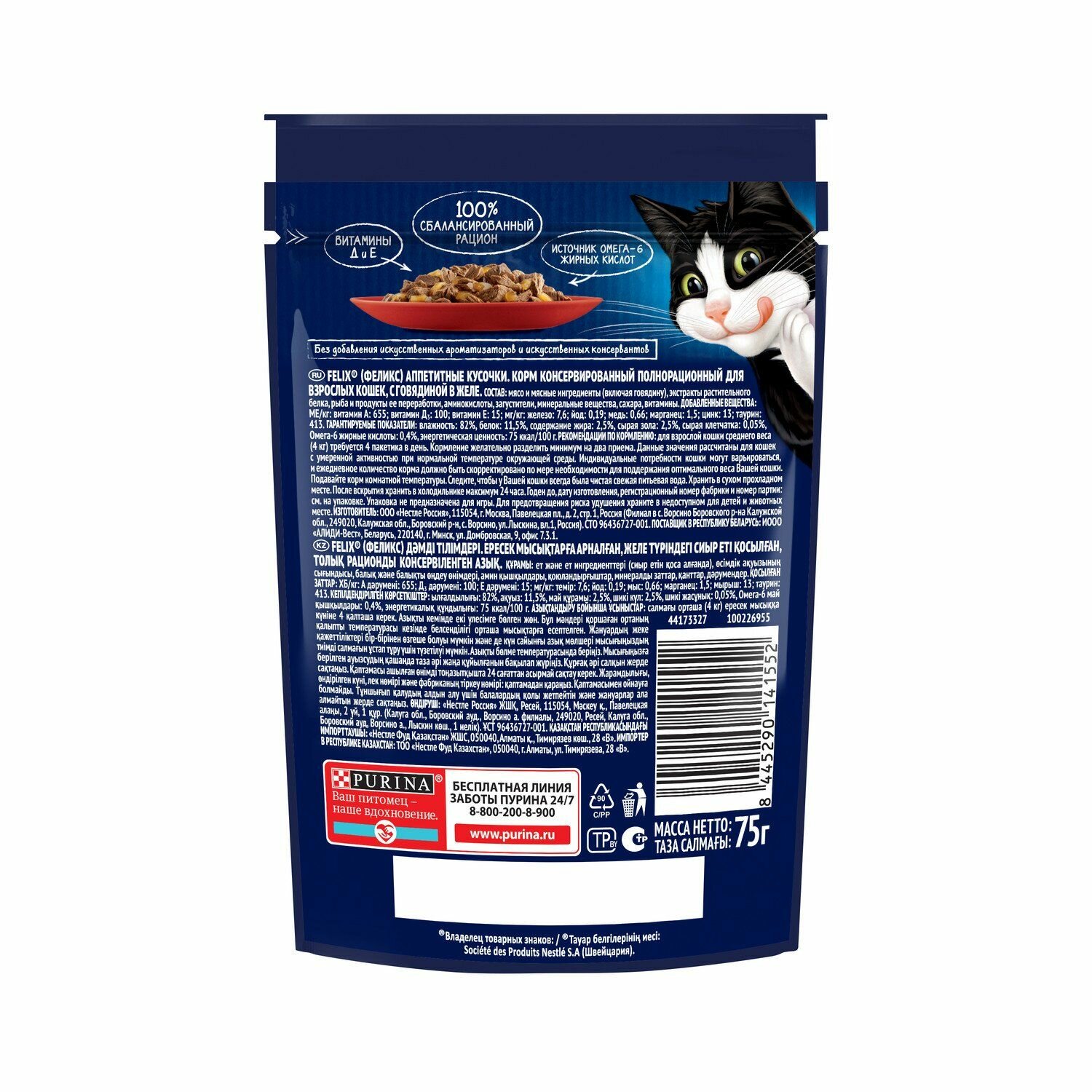 Влажный корм FELIX Аппетитные кусочки для кошек, говядина и домашняя птица в желе, пауч 75 г