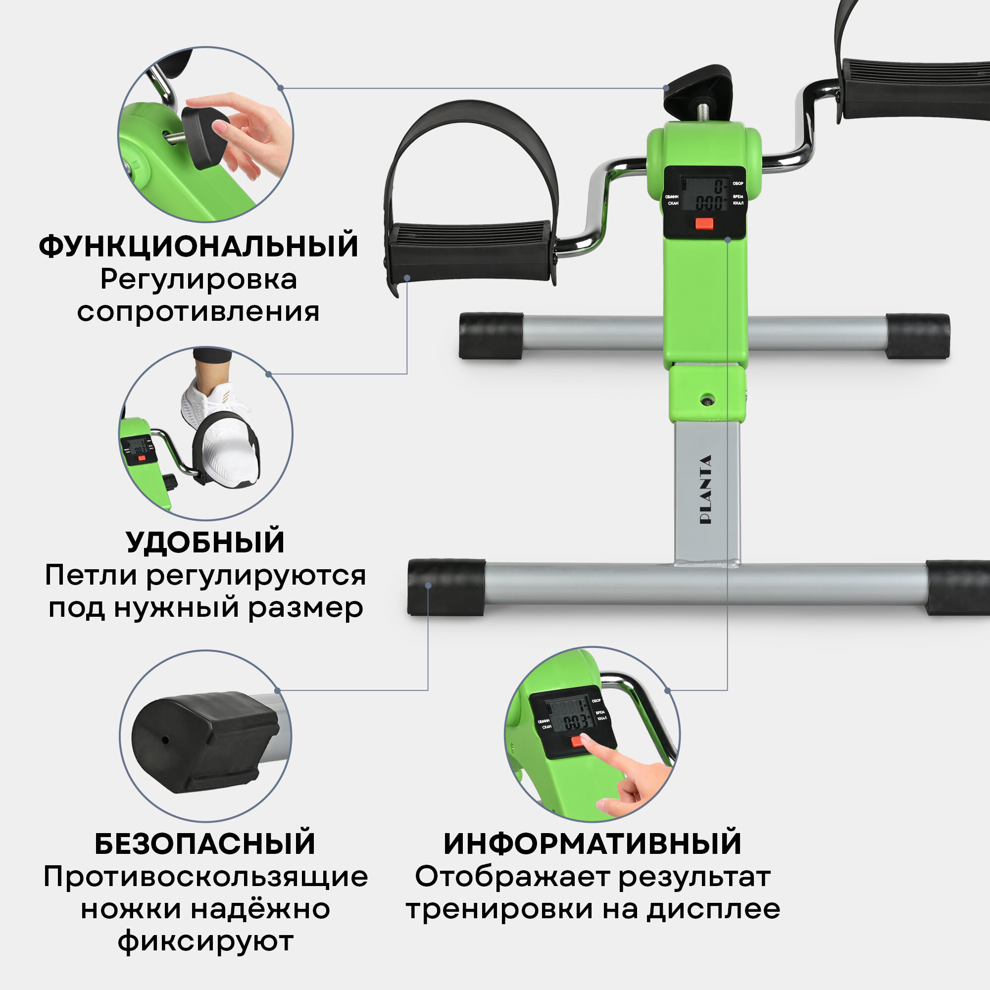 PLANTA Мини-велотренажер складной педальный для реабилитации для рук и ног FD-BIKE-001 с регулятором нагрузки, кардио тренажер, дисплей: обороты, время, скорость, калории