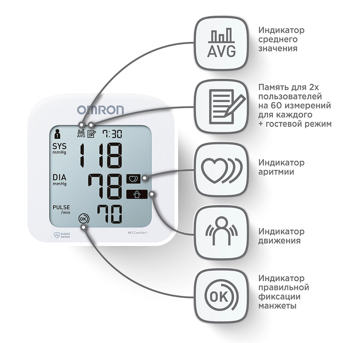 Купила тонометр Omron M3 Comfort на замену своего старенького тонометра. В товаре этой марки не сомневаюсь, дома есть термометр и небулайзер, тоже omron – отличное качество. Тонометр компактный, работает от батареек. Адаптер отдельно можно приобрести, но мне и так удобно, батареек хватает надолго. Нравится своей уникальной манжетой, адаптированной под каждого пользователя. С большим дисплеем, на котором отлично видны все показатели. Есть память на 60 измерений с датой и временем. Несколько индикаторов (аритмии, положения манжеты, движения). В целом отличный, удобный, точный прибор с большим функционалом. Рада, что выбрала эту модель.