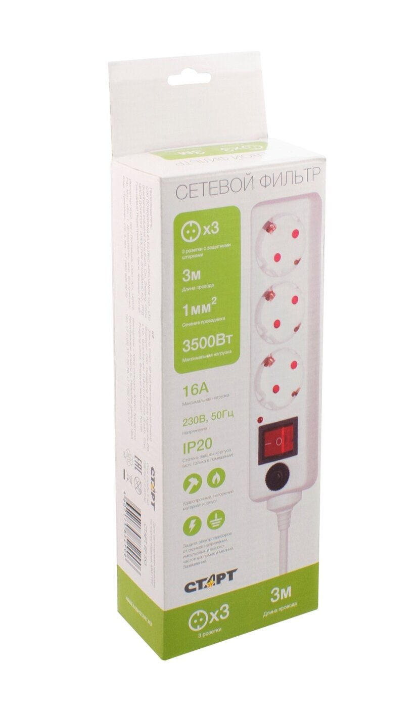 Сетевой фильтр Старт С/УД-Ф SP 5x3, 3,5 кВт, 16 А, с заземлением, с кнопкой, 5 розеток, 3 м, белый