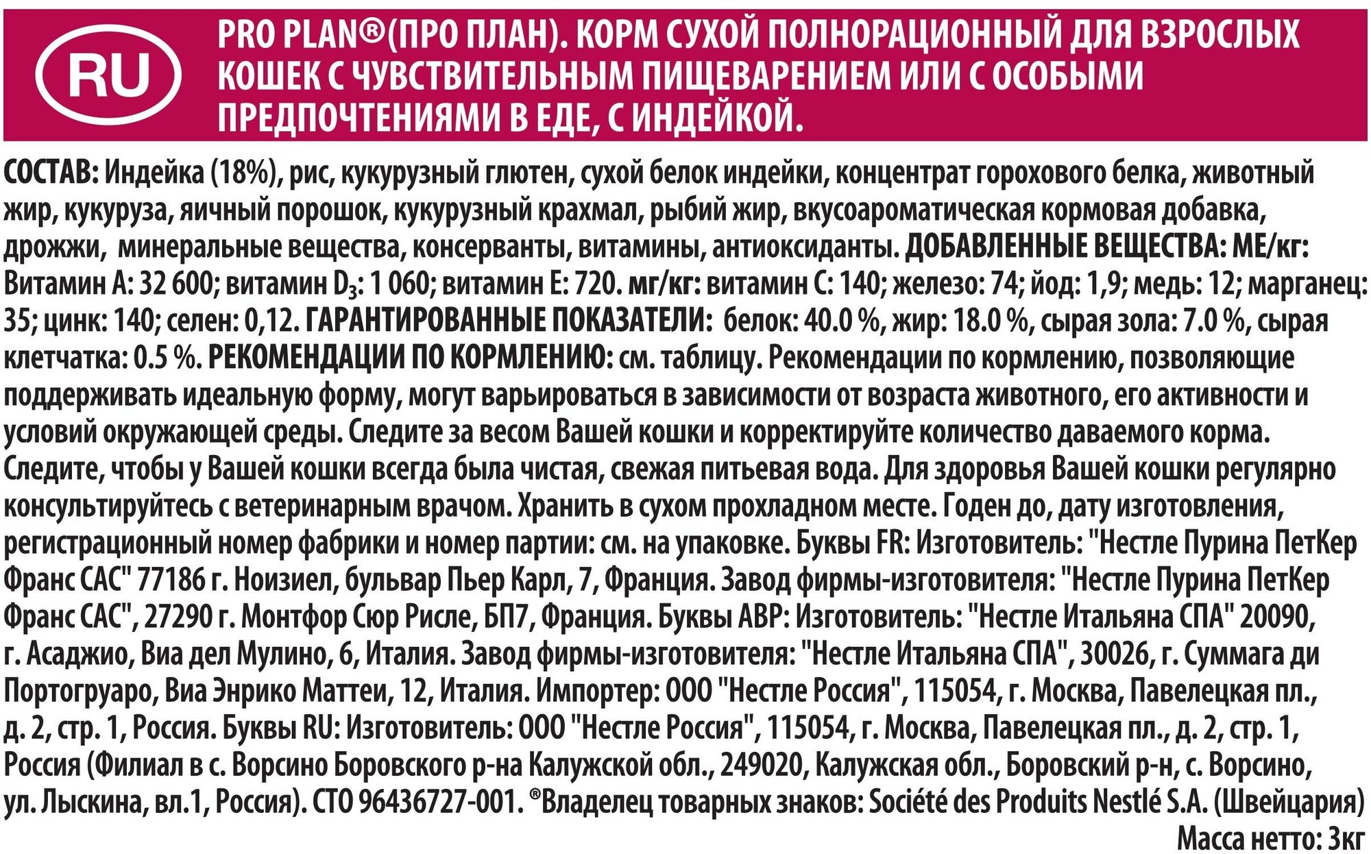 | Дополнительная информация | Рекомендации по кормлению, позволяющие поддерживать идеальную форму могут варьироваться в зависимости от возраста животного, его активности и условий окружающей среды. Следите за весом Вашей кошки и корректируйте количество даваемого корма. Следите, чтобы у Вашей кошки всегда была чистая, свежая питьевая вода. Для здоровья Вашей кошки регулярно консультируйтесь с ветеринарным врачом. |