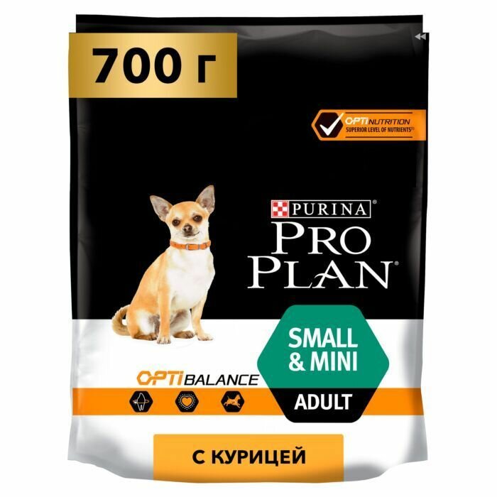 Сухой корм Pro Plan для взрослых собак мелких и карликовых пород с комплексом OPTIBALANCE® с курицей и рисом, Пакет, 700 г
