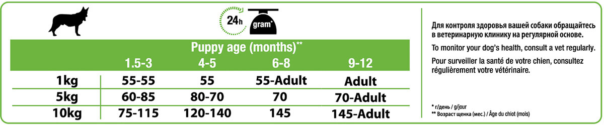 | Дозировка | Кормление в период роста: с 3 по 6 неделю начинайте давать размоченный корм 3–4 раза в день. . После полного прекращения кормления материнским молоком кормите согласно таблице. |