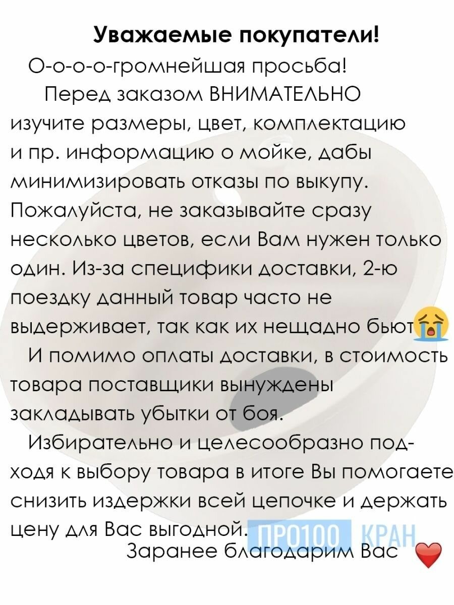 | Минусы: | Раковину доставили другого цвета, вместо бежевой привезли черную без отверстия под кран, Докупили сверло по мрамору Д- 35мм. это еще 500руб.просто на ветер .при сборке, не оказалось гофры на слив,пришлось докупать, еще затраты трубка гофре на перелив круглая. а уголок который крепится к раковине плоский, кое как собрали, Стоял вопрос о замене раковины по переписке со службой поддержки, писала заявление на возврат,ответ один .Вопрос будет решаться очень долго и не факт, что в мою пользу. так что при выборе делайте выводы с кем сотрудничать а с кем нельзя. |