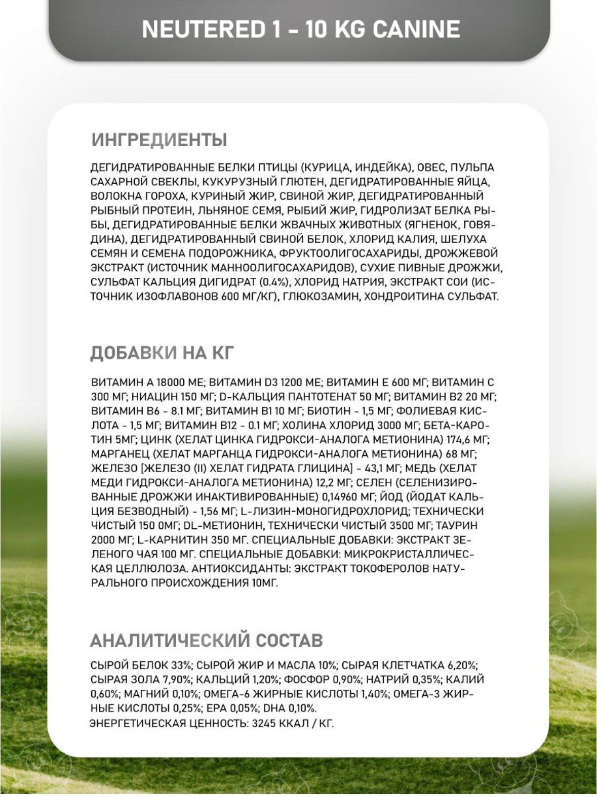 | Состав | дегидратированное куриное мясо, овес, пульпа сахарной свеклы, кукурузный глютен, дегидратированные цельные яйца, волокна гороха, куриный жир, дегидратированная рыба, льняное семя, рыбий жир, гидролизат животных белков, калия хлорид, растительное масло, подорожник, фруктоолигосахариды, маннанолигосахариды, сухие пивные дрожжи, сульфат кальция дигидрат (0,4%), хлорид натрия, экстракт сои (источник изофлавонов 600мг/кг), глюкозамин, хондроитин сульфат, экстракт календулы (источник лютеина) |