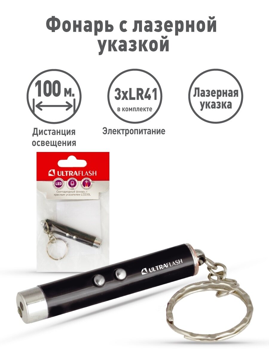 Ultraflash LED30L (фонарь, 1LED+лазерная указка 3xAG3, черный, алюм., блистер-пакет)