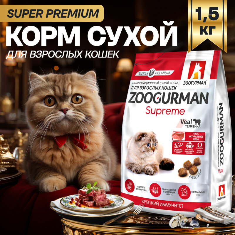 Полнорационный сухой корм для взрослых кошек Зоогурман Supreme,Телятина 1,5 кг