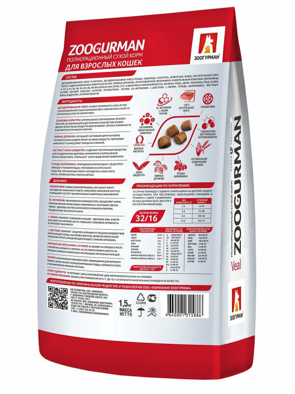 Зоогурман Сухой корм для взрослых кошек с телятиной 1.5 кг