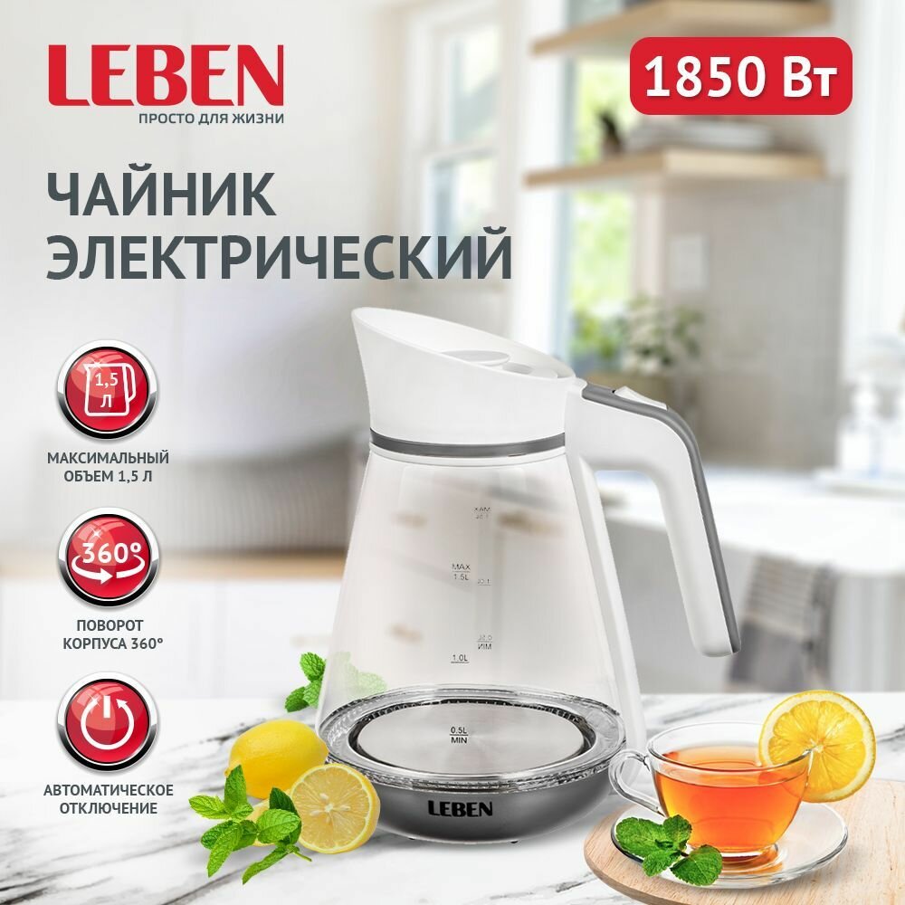 LEBEN Чайник электрический 1,5л, 1850Вт, скрытый нагр.элемент, автооткл., стекло-кувшин