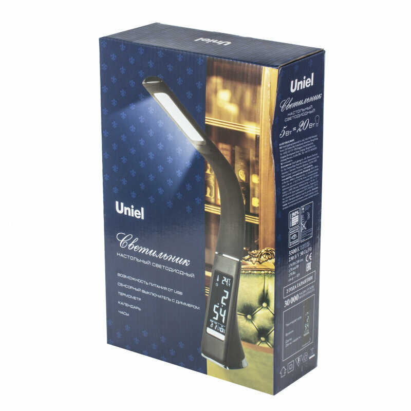 Свет. LED TLD-542 с часами, календарем, терм., 300Lm/5000K/Dimmer, 5W. сенс. выкл., черный (под кожу), Uniel