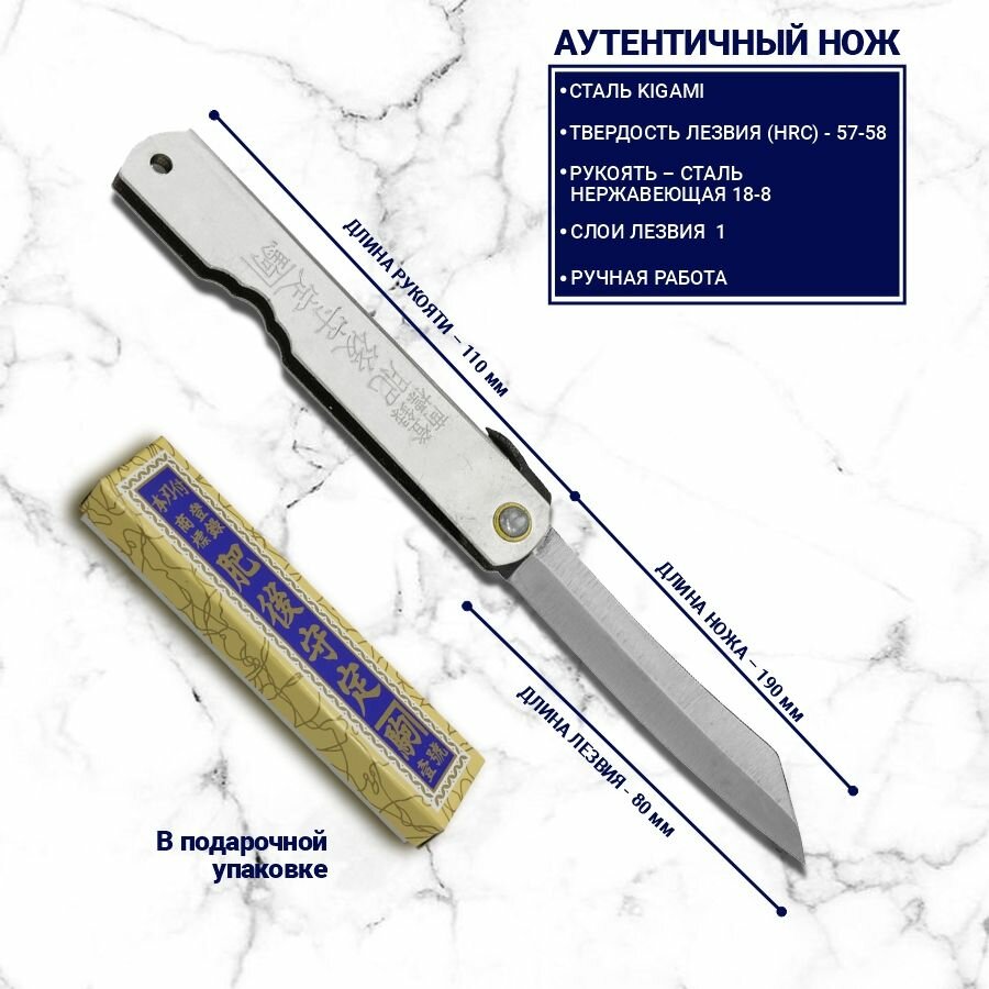 | Дополнительная информация | сталь - Kigami, количество слоев стали - 1, рукоять - сталь нержавеющая 18-8, заточка #4000, форма Nagao Higonokami, отверстие на рукоятки для подвеса |