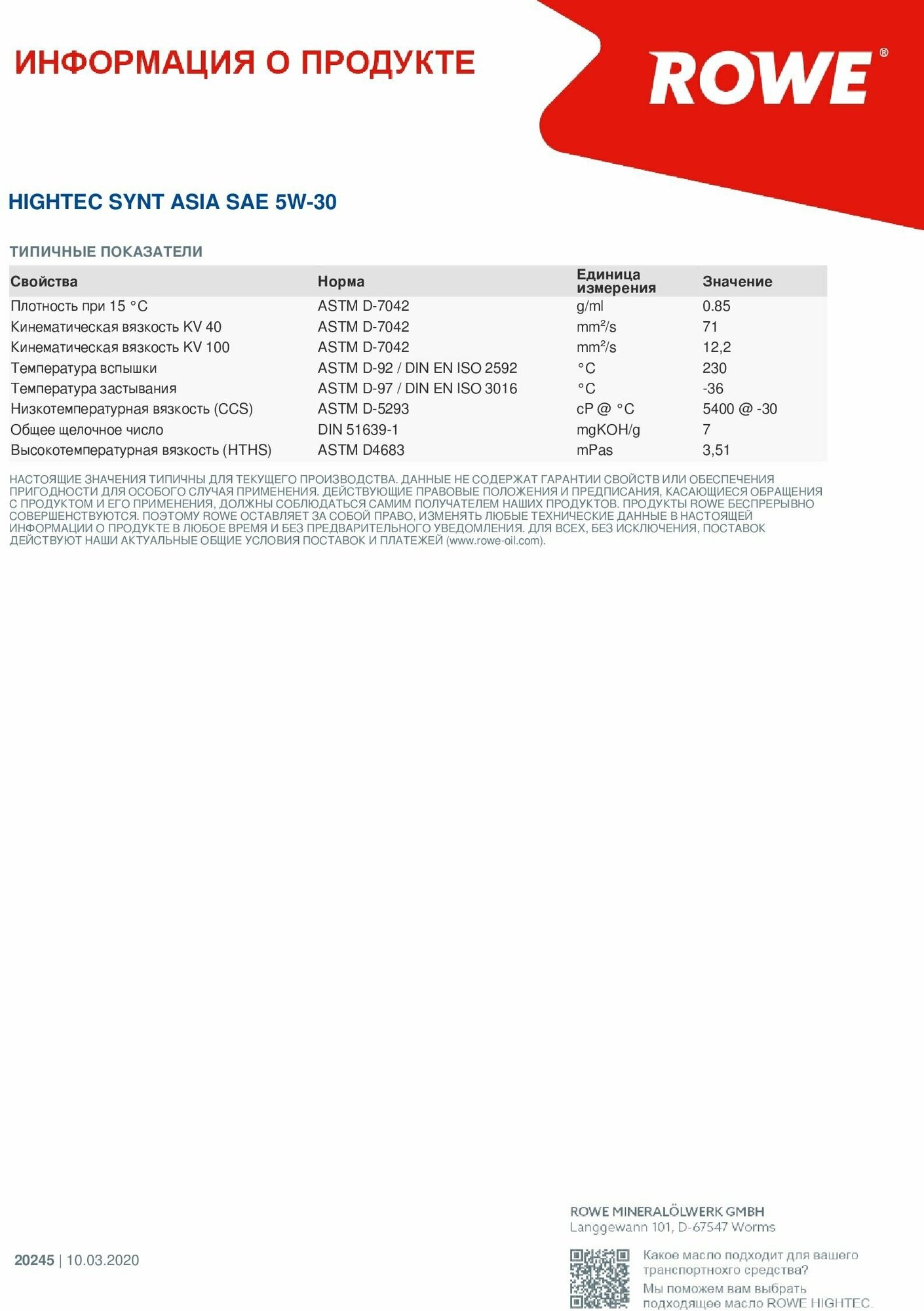 ROWE 20245-0040-99 Масло Моторное Hightec Synt Asia 5w-30 (4л) Rowe 20245004099