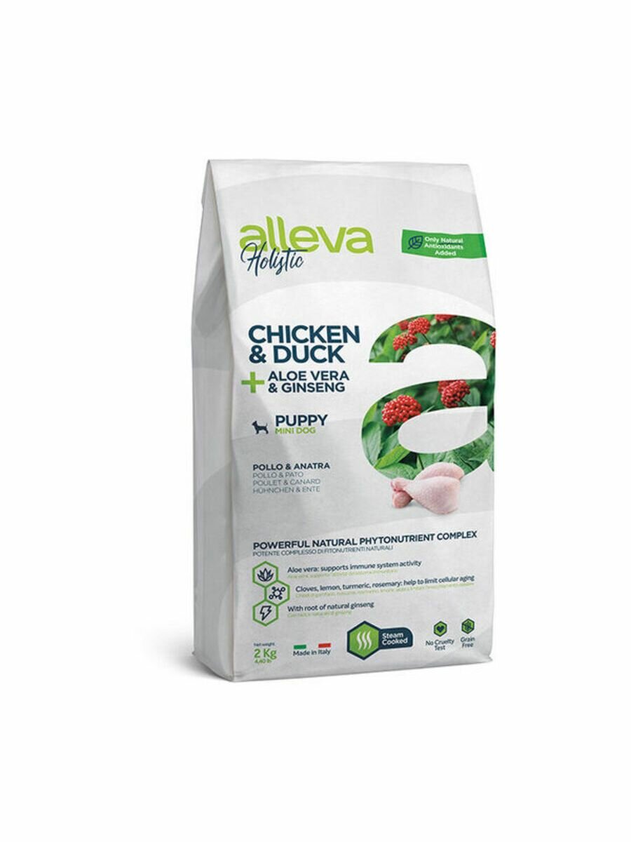 Сухой корм для щенков мелких пород Alleva Holistic, беззерновой, курица с уткой, алоэ вера и женьшенем, для беременных и кормящих, 2 кг