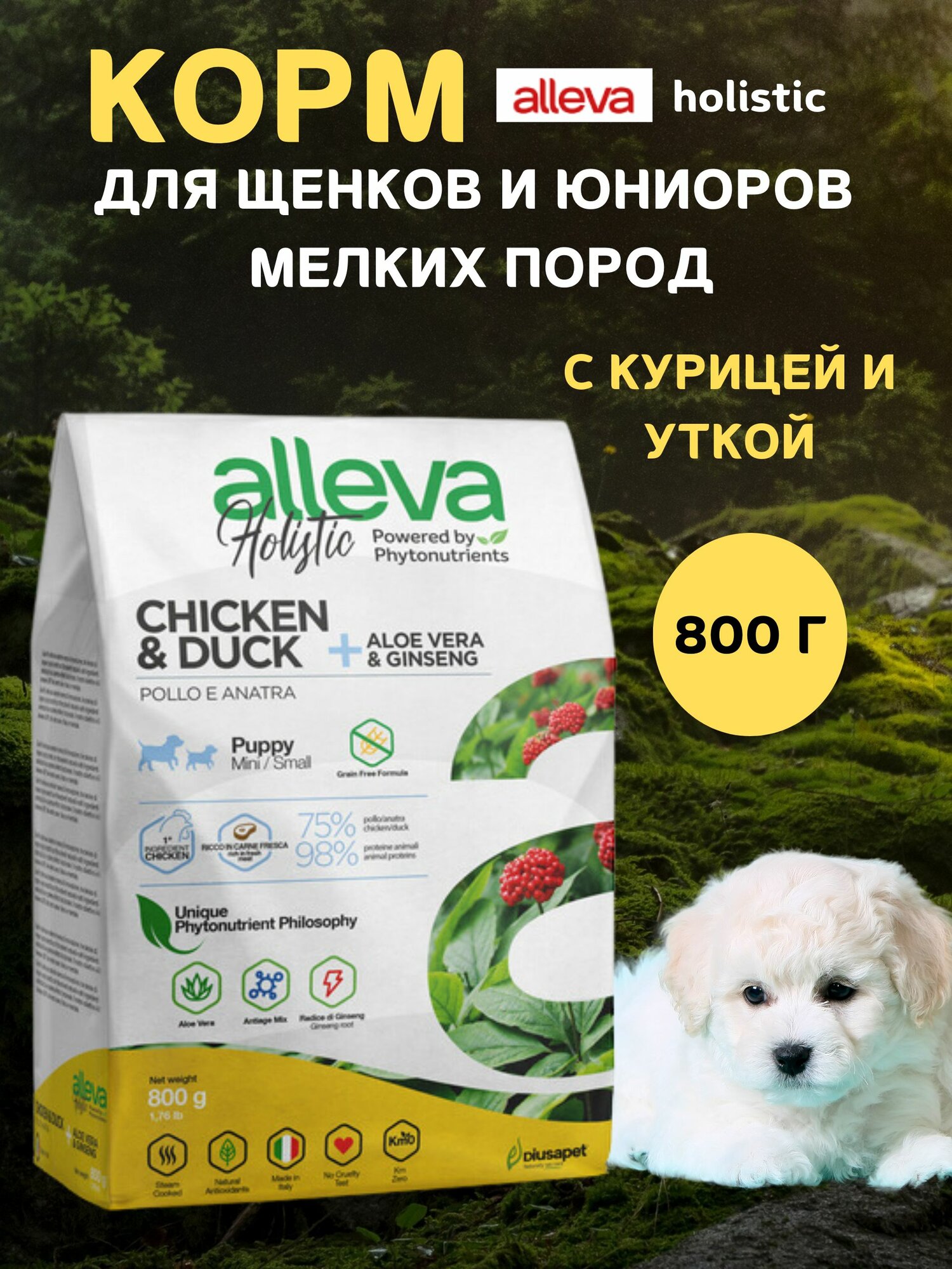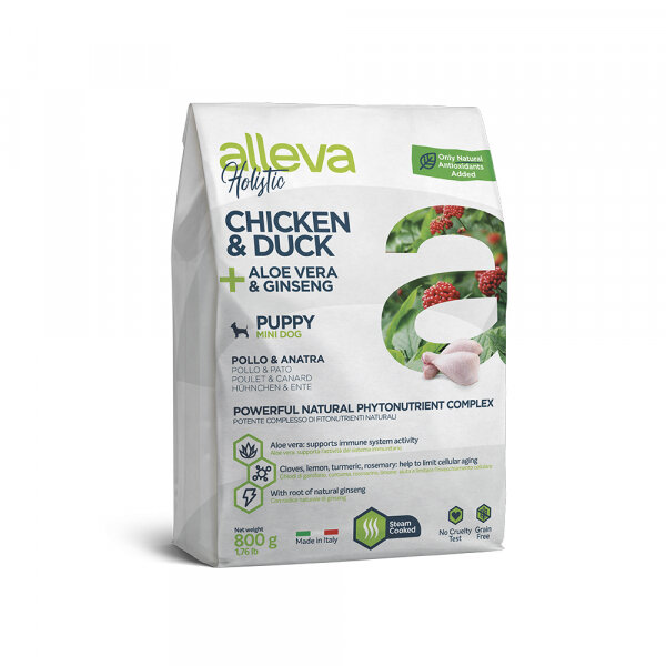 ALLEVA HOLISTIC DOG для собак PuppyJunior Chicken Duck Mini с курицей и уткой, алое вера и женьшенем 0.8кг 2196