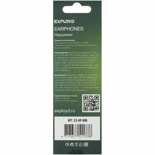 Наушники EXPLOYD EX-HP-866 проводные, вакуумные, 1,2м, чёрный