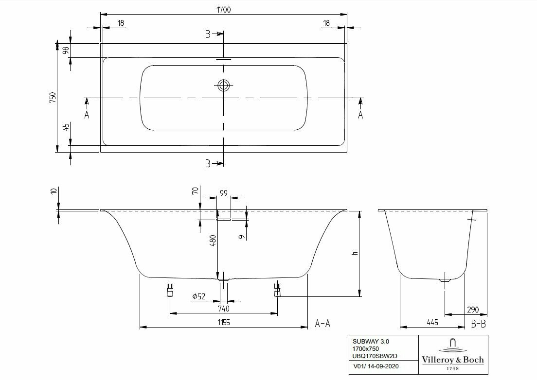 Квариловая ванна 170х75 см Villeroy&Boch Subway 3.0 UBQ170SBW2DV-01 с ножками и сливом-переливом
