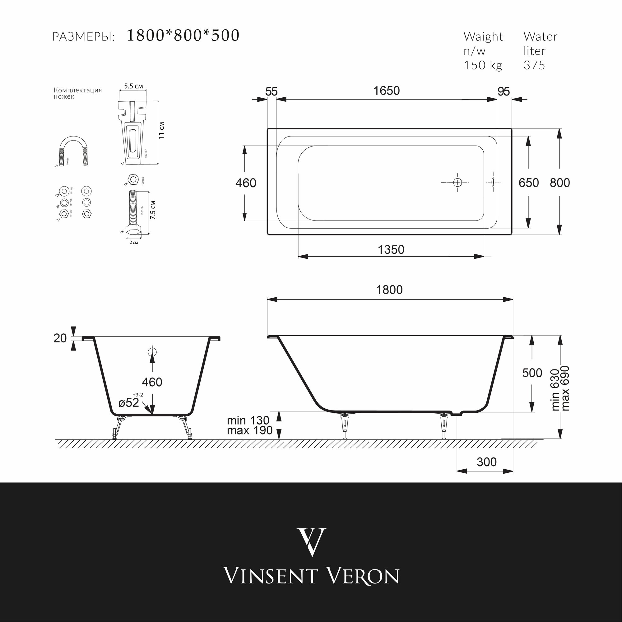 Купить Чугунная ванна Vinsent Veron Kingston 180x80x50