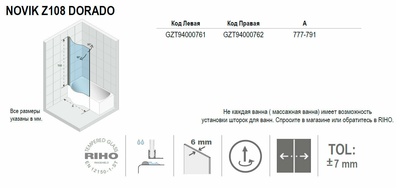 Шторка для ванны Riho NOVIK Z108 DORADO правая GZT94000762