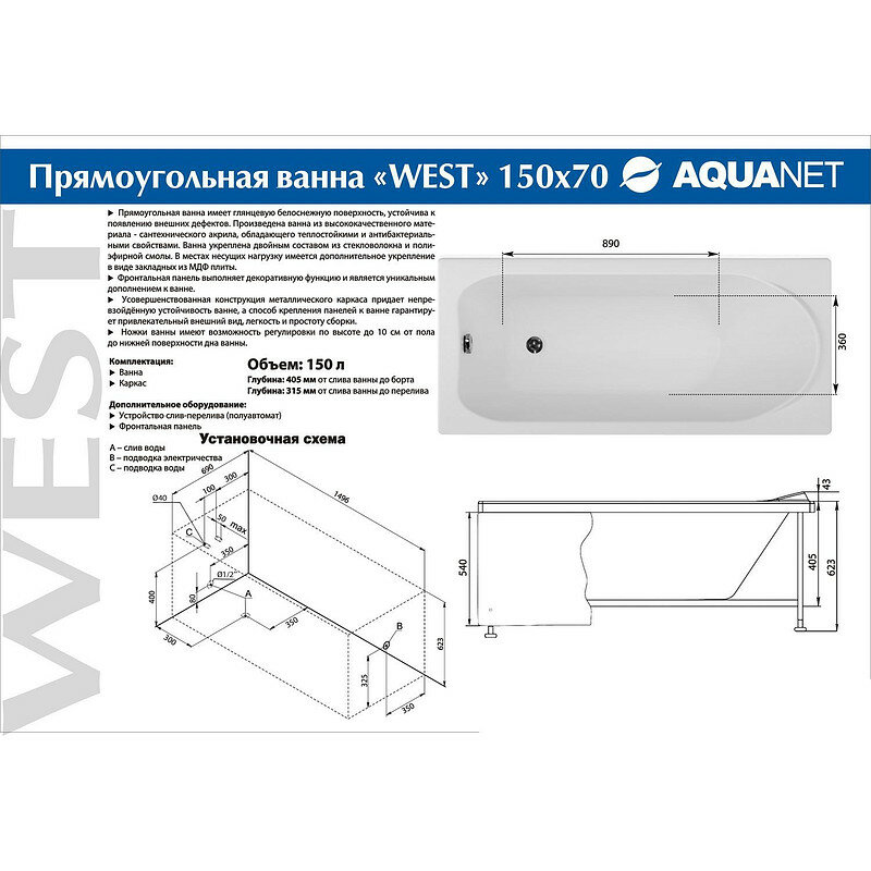 Ванна акриловая Aquanet West 00240462 150x70 с каркасом