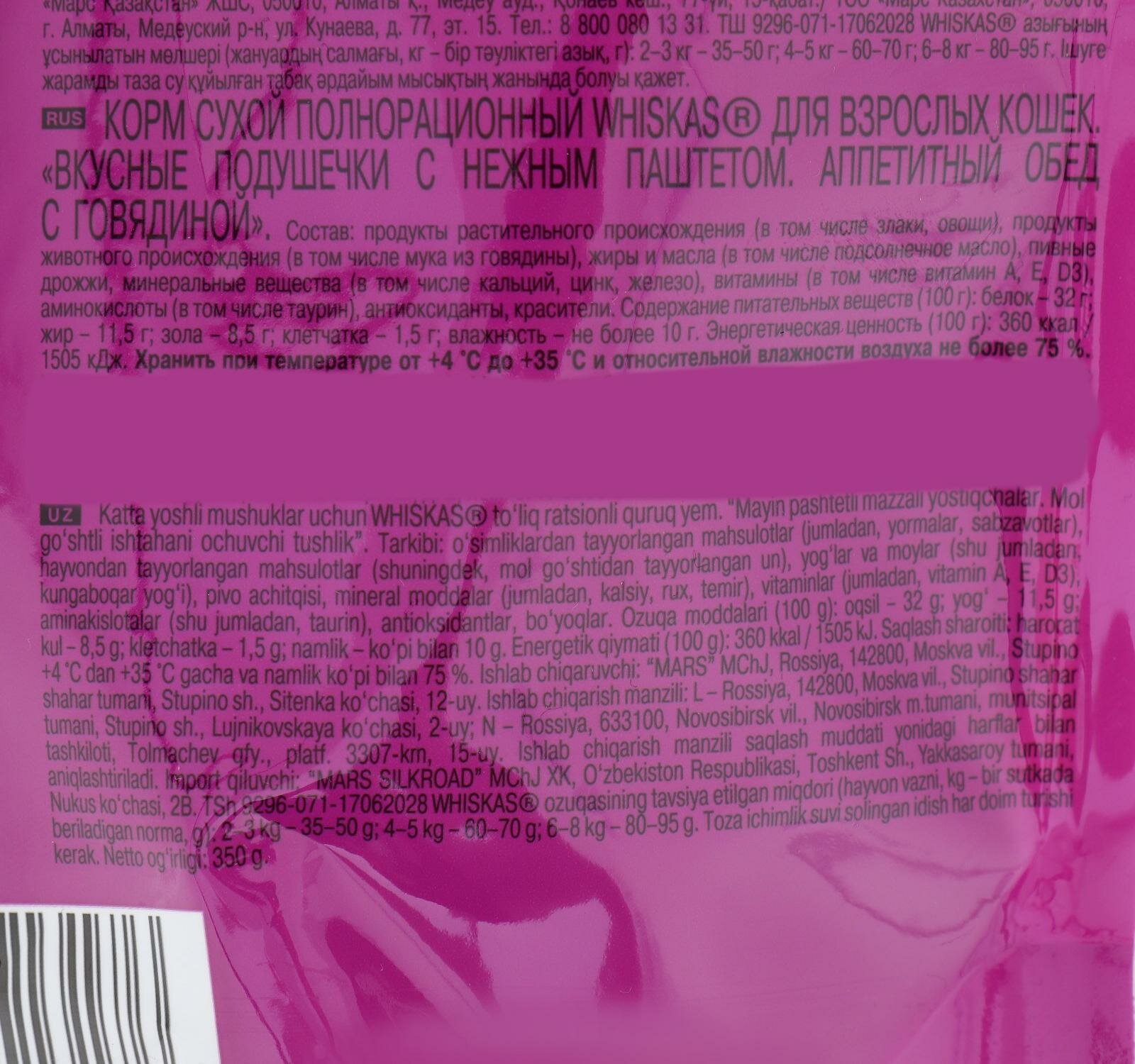 СохранитьWHISKAS аппетитный обед для взрослых кошек c говядиной с нежным паштетом (0,35 кг) интересное:
