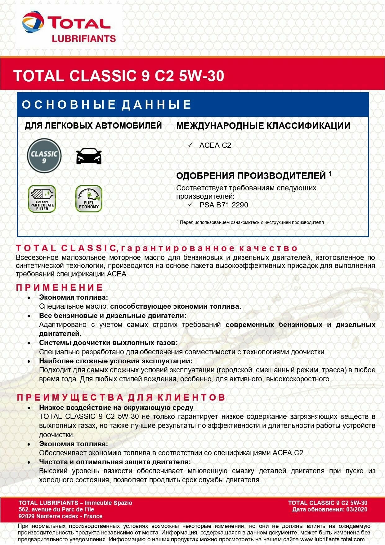 TOTALENERGIES 213787 Масо моторное синтетическое 1 TOTAL CLASSIC 9 C2 5W30 ACEA C2 Допуски OEM PSA B71 2290