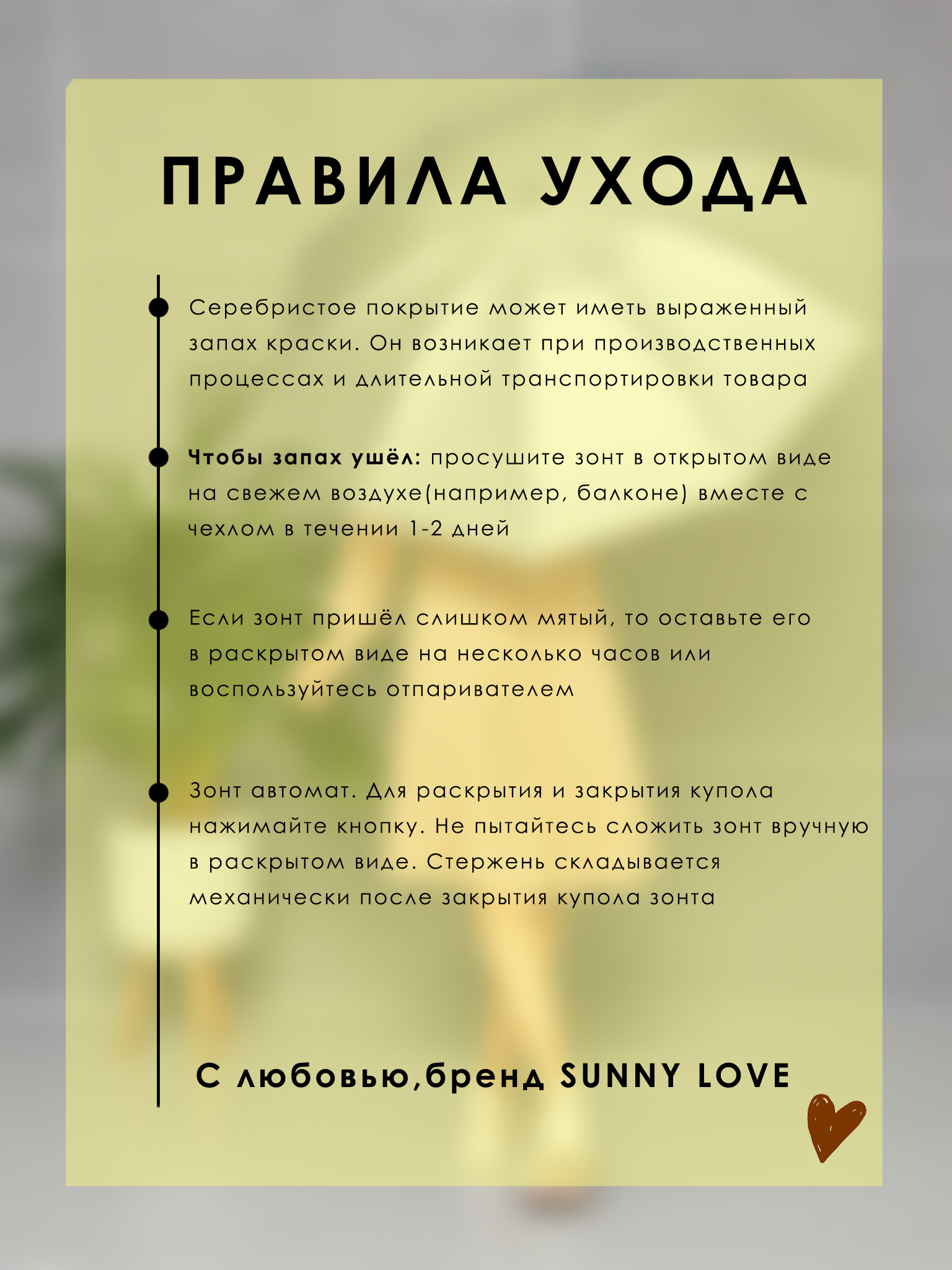 | Отзыв: | Зонт настолько хорошо защищает от солнца и спасает в жаркие дни, что я заказывала его 3 раза, несмотря на то, что первый раз товар приехал поврежденным, а второй мой заказ курьер потерял. Специально искала зонт с серебряным куполом, так как простые зонты не защищают от солнца на 100%, а у меня аллергия. |