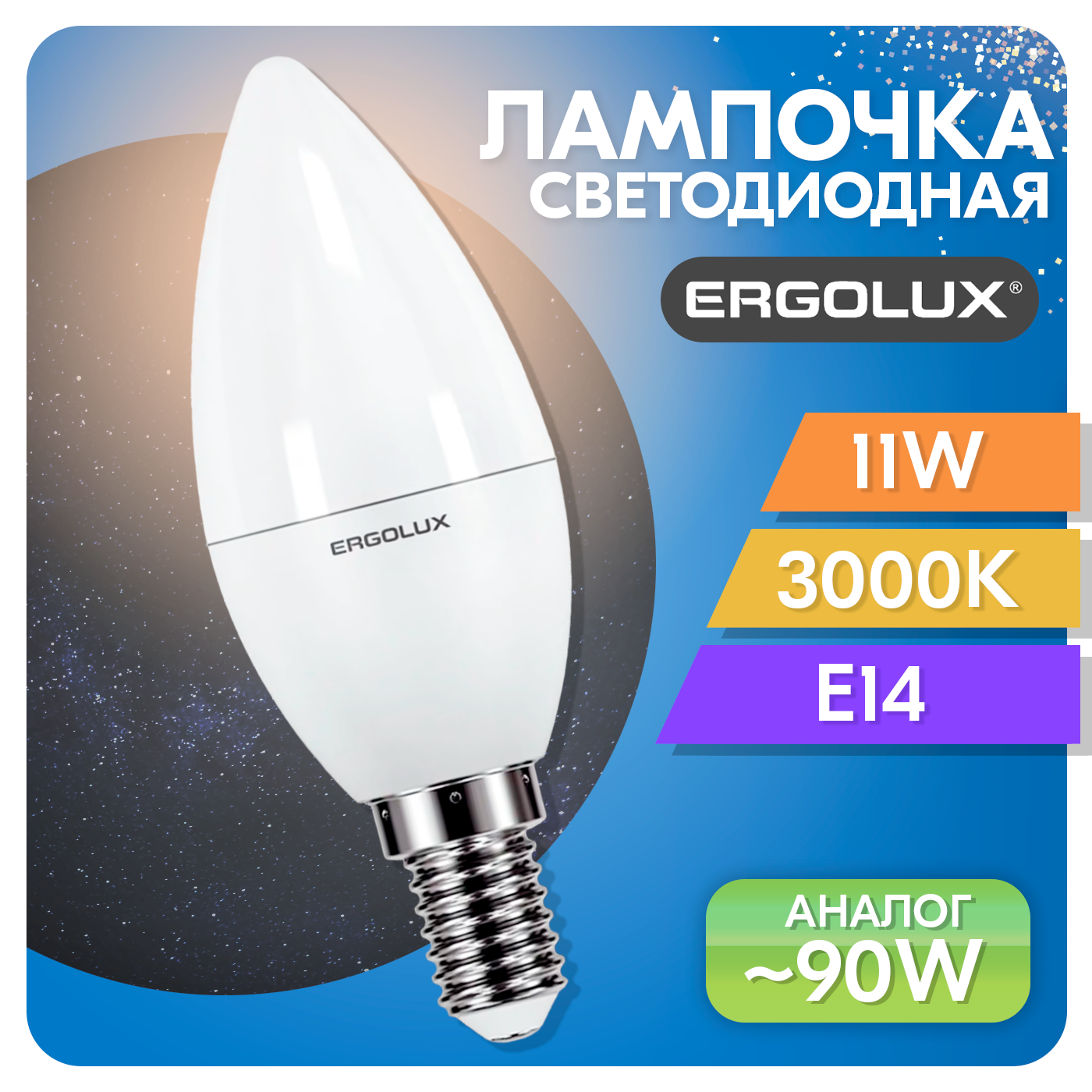 Лампочка светодиодная C35 Ergolux, 11Вт 220В, цоколь Е14, теплый свет 3000К, 1 шт.
