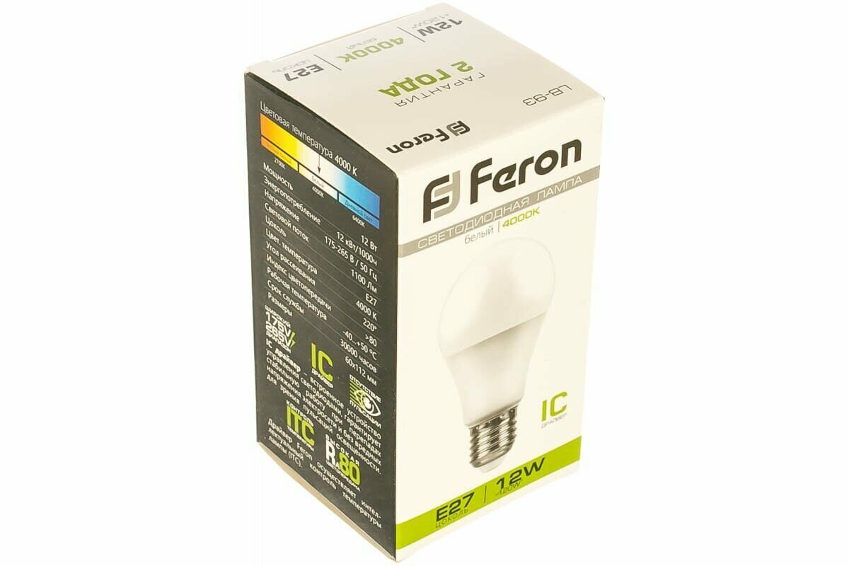 (20 шт.) Светодиодная лампочка Feron ЛОН A60 E27 12W(1100lm) 4000K 4K 118x60 LB-93 25487 Нейтральный белый. Цоколь E27