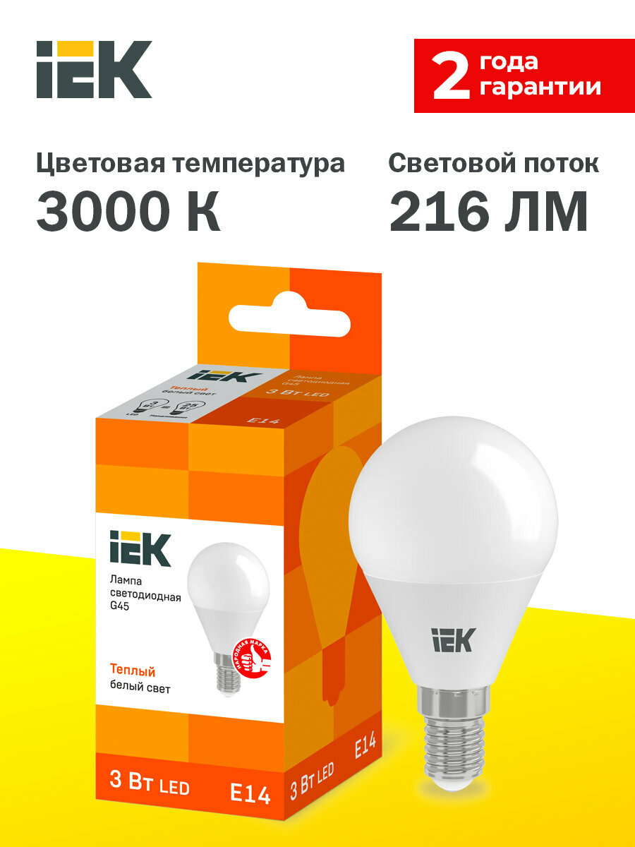 Лампа светодиодная ECO G45 шар 3Вт 230В 3000К E14, IEK LLE-G45-3-230-30-E14 (10 шт.)