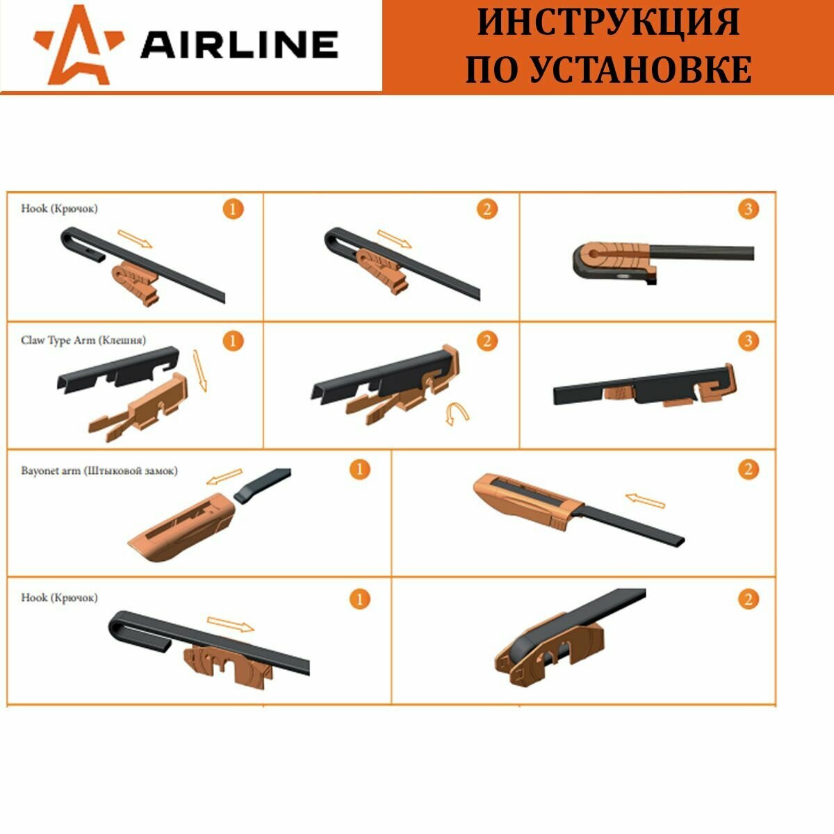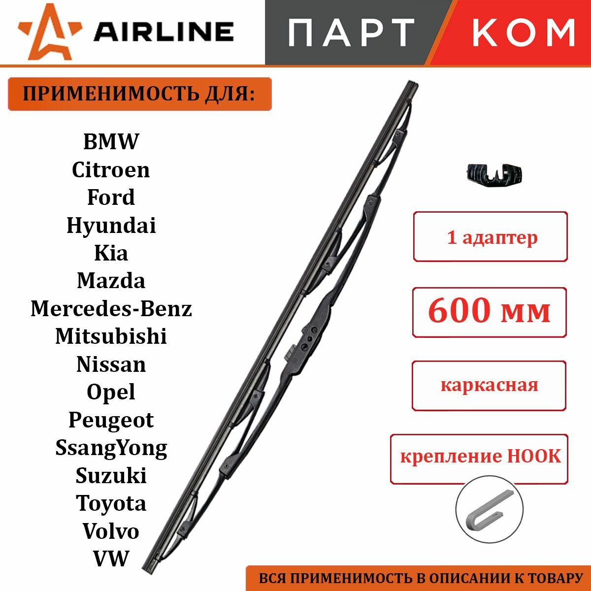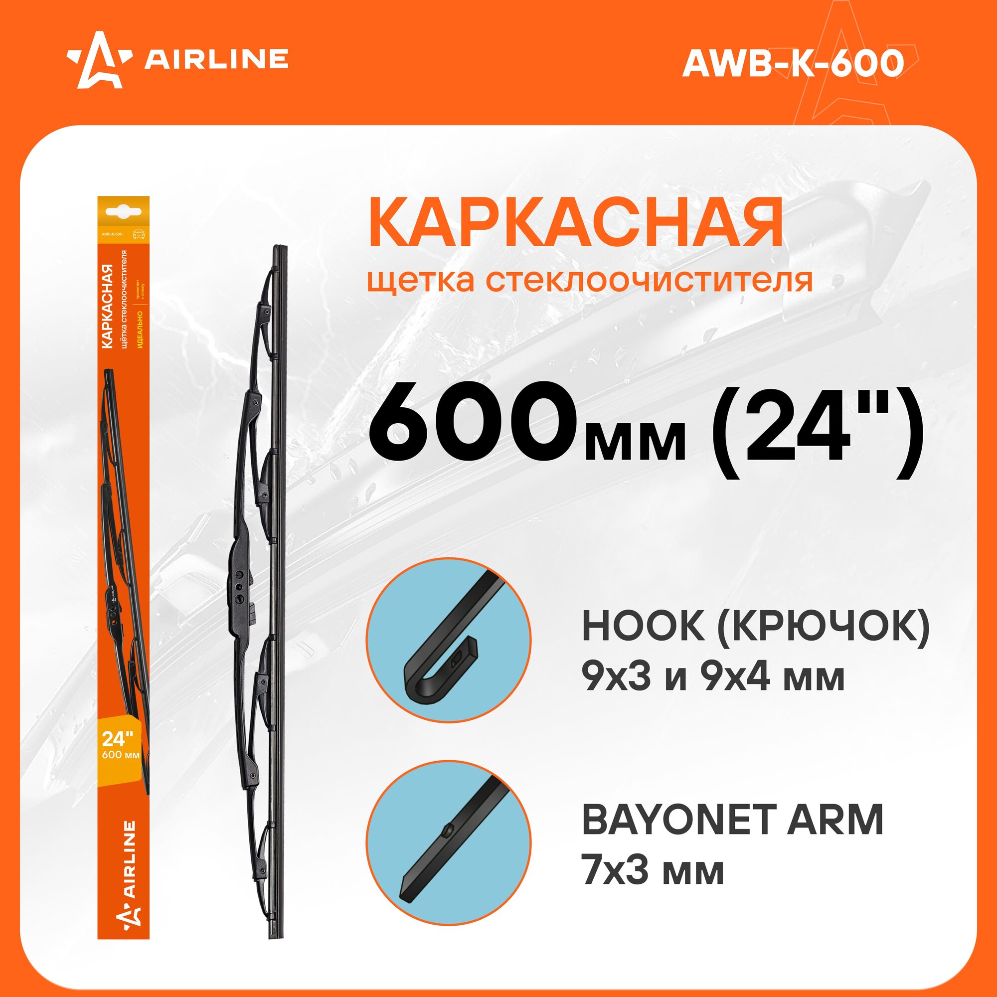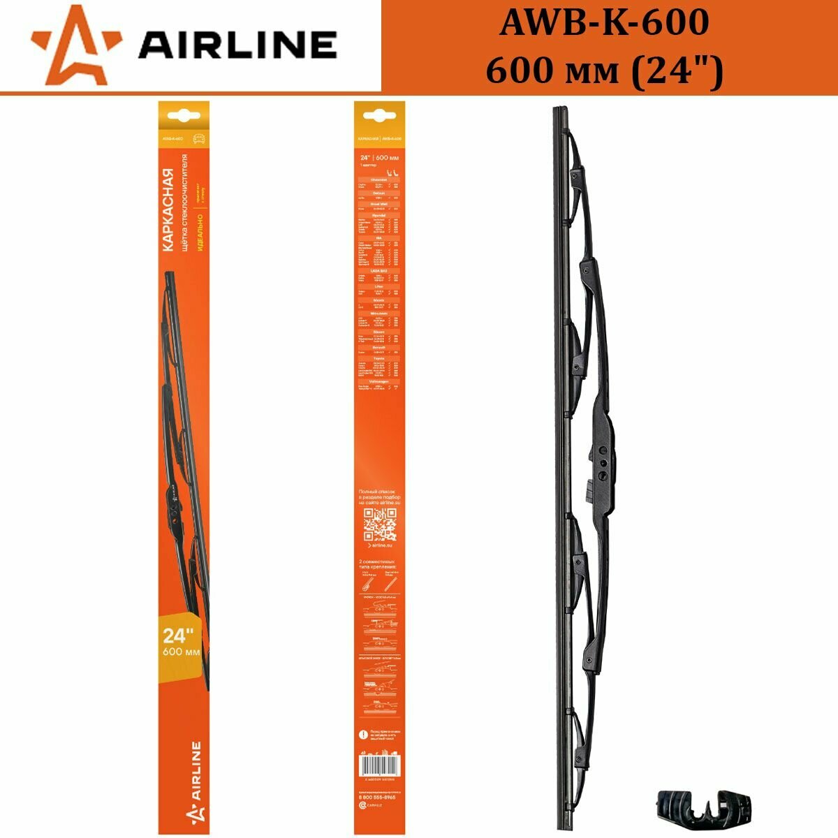AIRLINE / awbk600 / Щетка стеклоочистителя 600 мм (24) каркасная, 1 адаптер