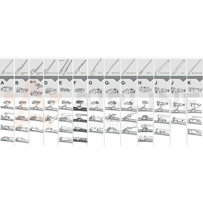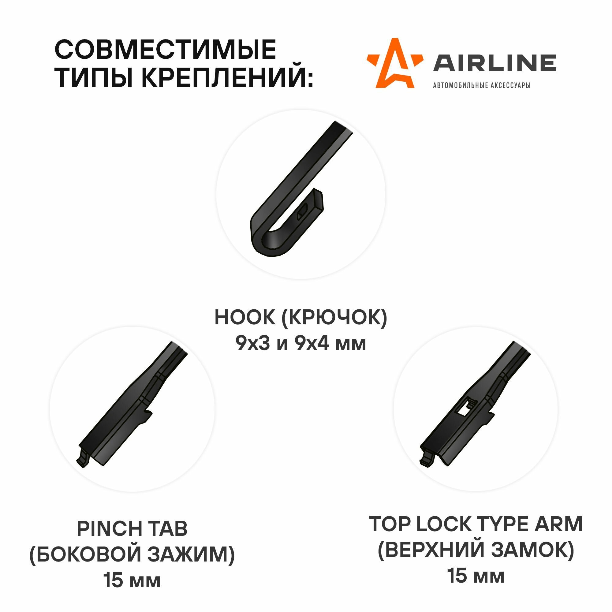 Щетки стеклоочистителя Airline 550мм (22") + 530мм (21") бескаркасные, всесезонные, крепления J-Hook, Pinch Tab, Top Lock, комплект 2 шт, арт. AWB-BK-550-530K