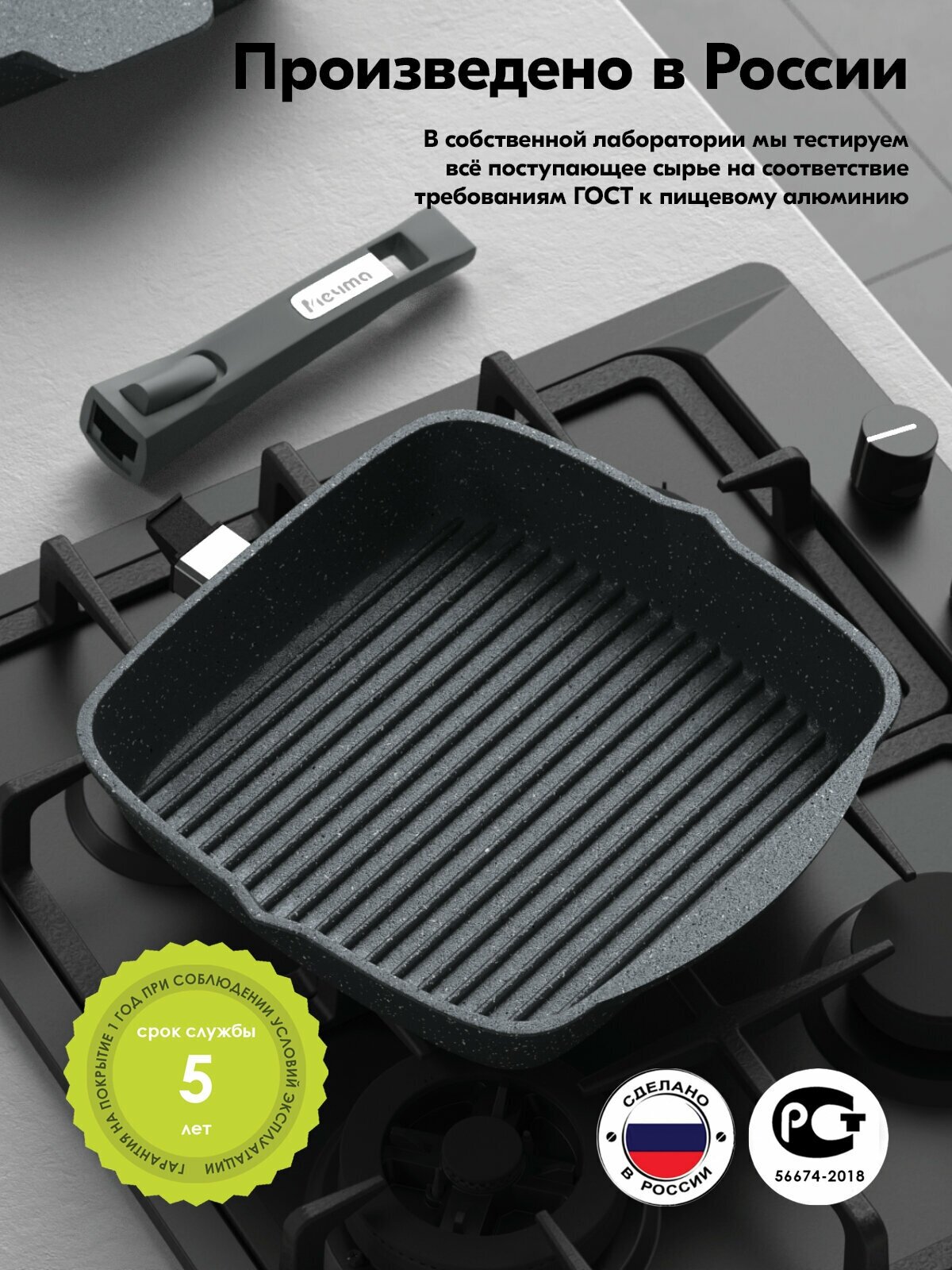 Сковорода гриль Мечта квадратная 26х26 см Гранит с антипригарным покрытием со съемной ручкой и крышкой, НЕ индукционная
