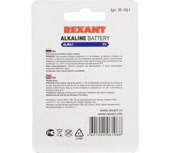 Ниже Вы можете прочитать отзывы на REXANT 301061 30-1061_батарейка алкалиновая! 6LR61 ''Крона'' 9V 1шт. блистер\, ознакомится с подробными характеристиками, посмотреть интересные обзоры и фотографии на REXANT 301061 30-1061_батарейка алкалиновая! 6LR61 ''Крона'' 9V 1шт. блистер\.