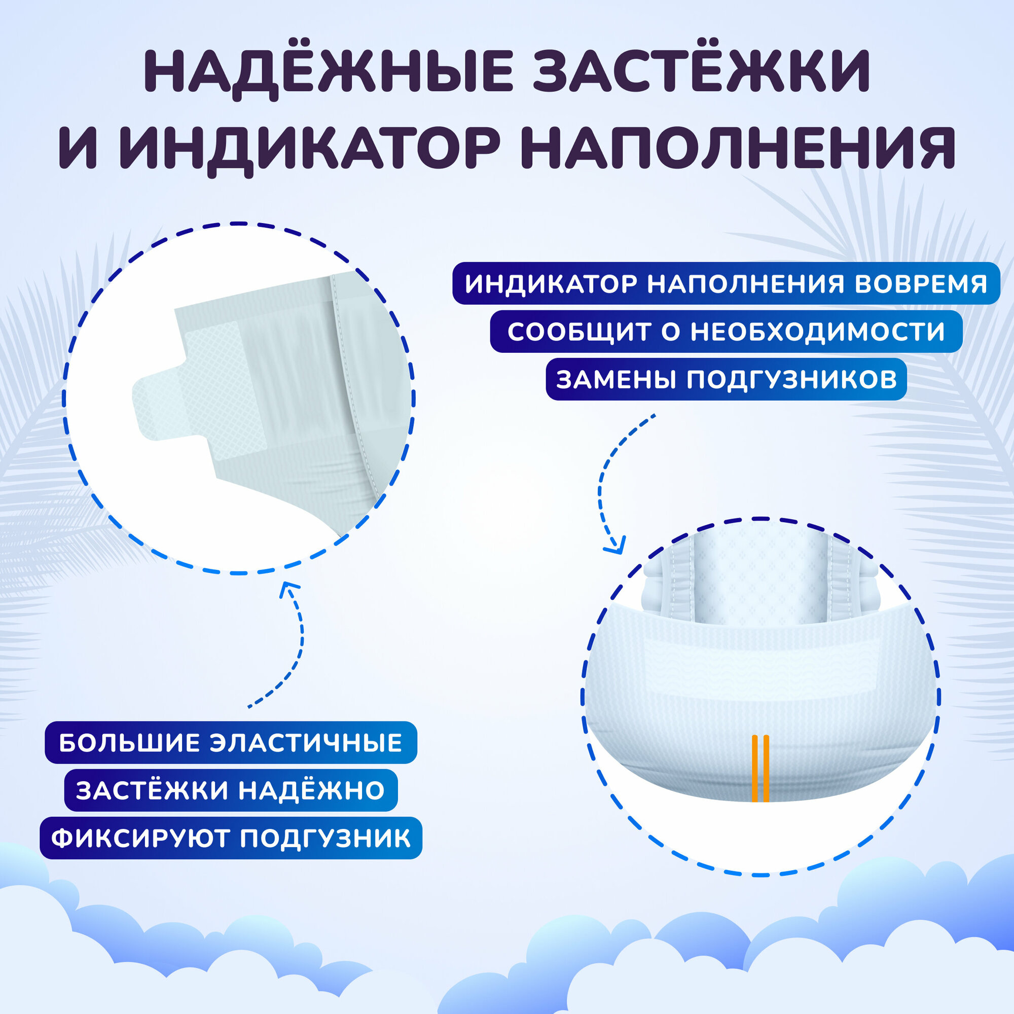 | Особенности | эластичные резинки вокруг ножек / многоразовые застежки-липучки / боковые внутренние бортики / индикатор наполнения / вырез для пупка |