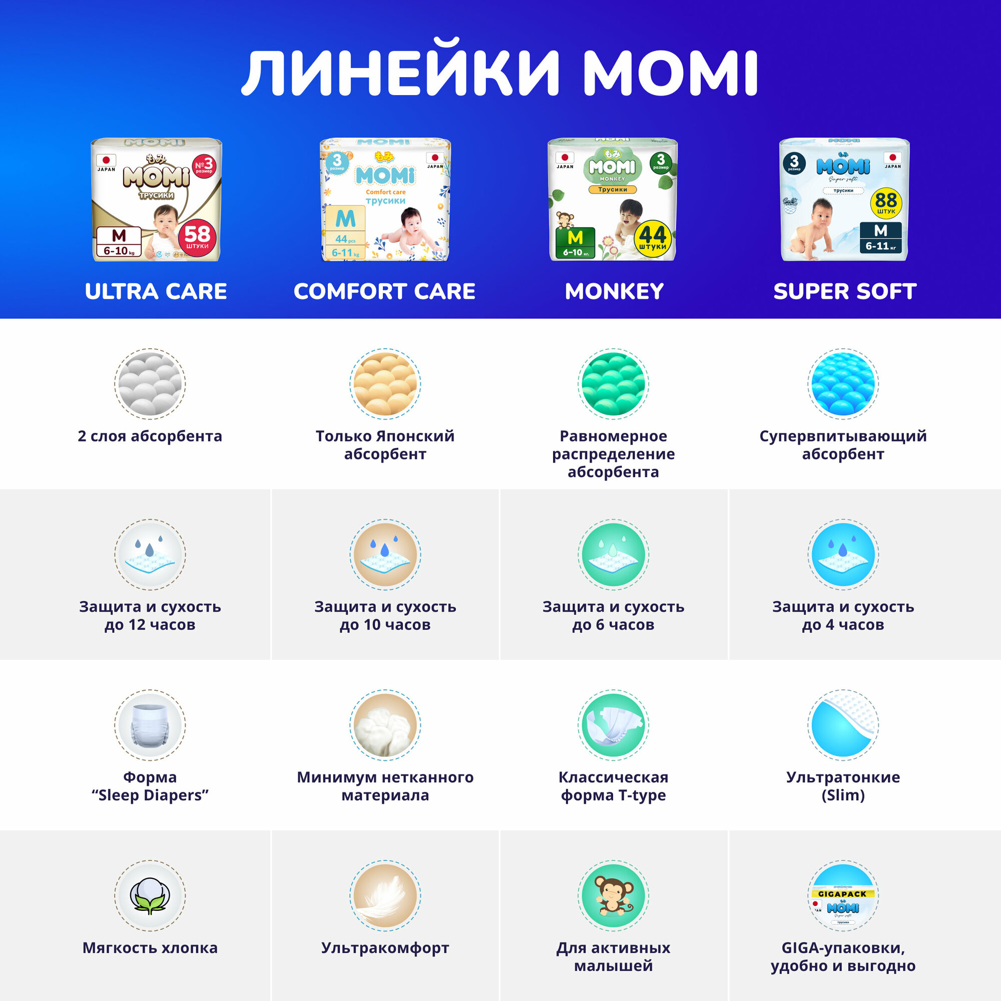 | Отзыв: | Ранее пользовались только Merries, всё устраивало. Решили поробовать более бджетнее вариант. Momi качеством и мягкость очень похожи на Merries. Пользуемся больше года и очень довольна. Рекомендую. |