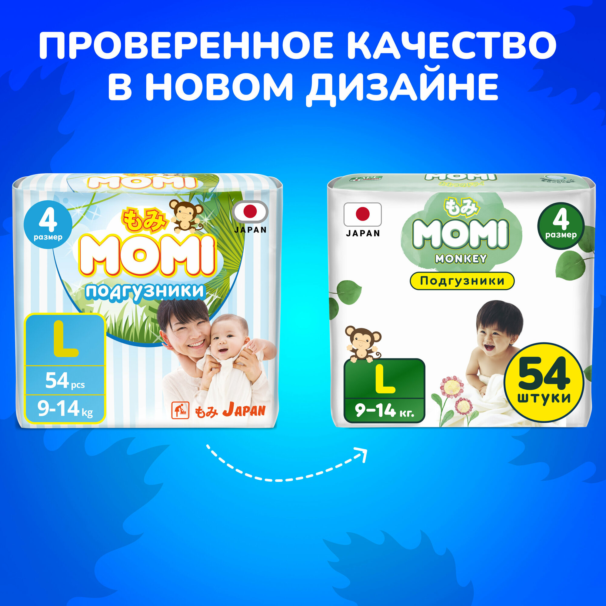 Momi MONKEY японские подгузники детские 9-14 кг, размер 4 L, 54 шт