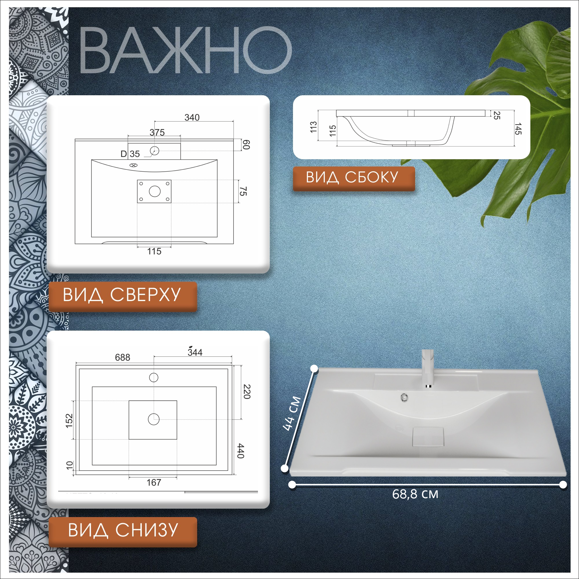 Раковина мебельная Комфорт 70, белая, литьевой мрамор, 69х44