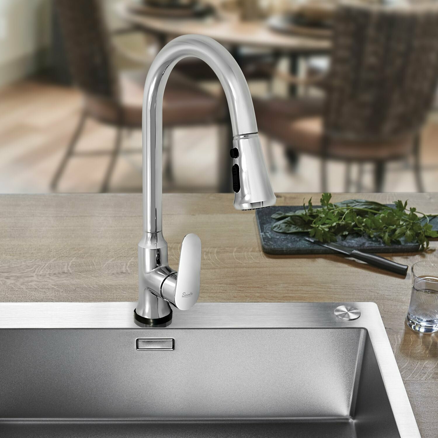 Смеситель для кухни мойки с тач сенсором (срабатывает от касания) излив вытяжной, 2 режима работы: поток / ополаскивание, питание батарейки, аэратор, цвет хром, Eleanti / Элеанти, Арт.: 0402.518