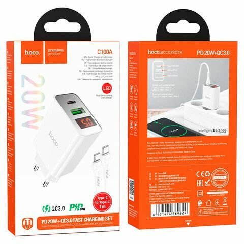Сетевое зарядное устройство Hoco C100A, PD20W+QC3.0, белый