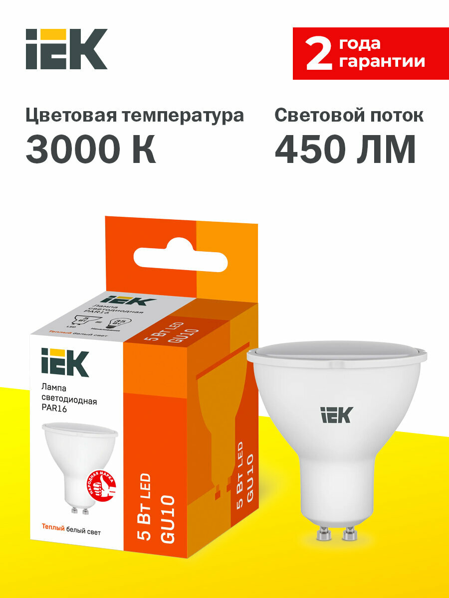 (10 шт.) Светодиодная лампочка IEK GU10 5W(450lm) 3000K 2K 60x50 матов. ECO LLE-PAR16-5-230-30-GU10 Нейтральный белый. Цоколь GU10