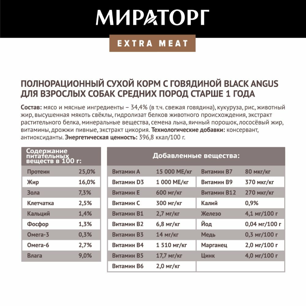 #(C)мираторг Black Angus Extra meat Полнорационный сухой корм с говядиной для взрослых собак средних