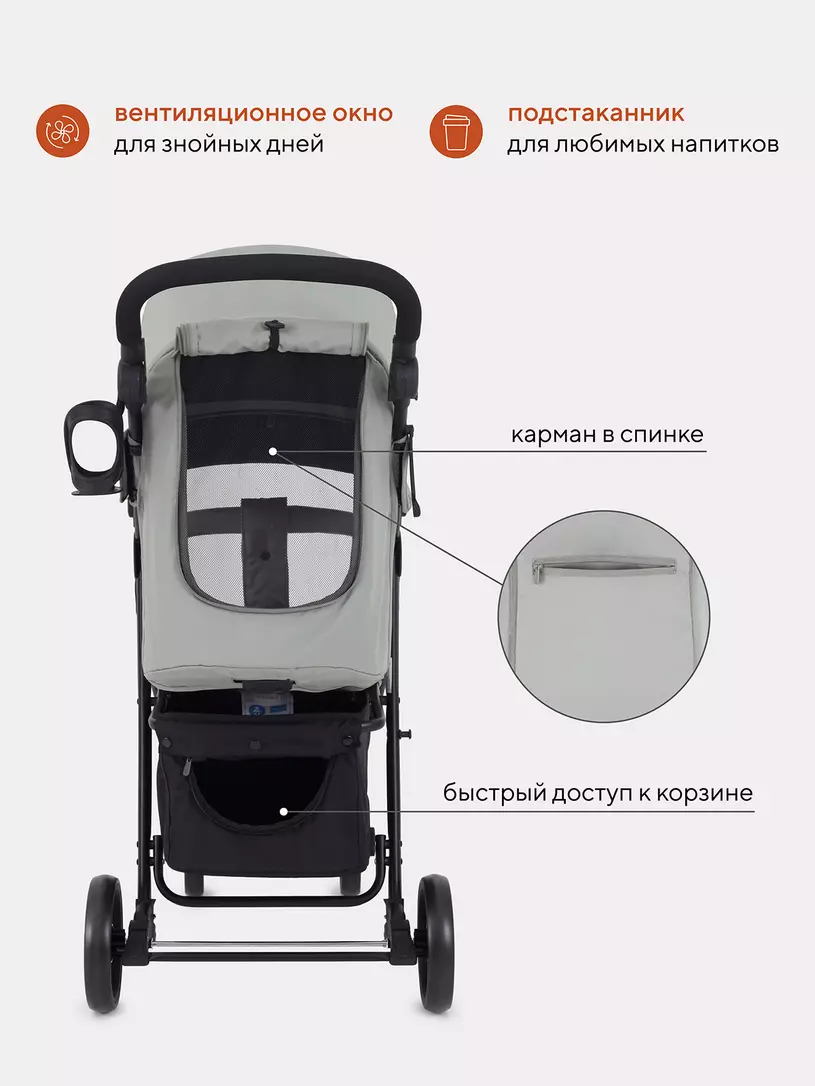 | Особенности | съемный бампер, ремни безопасности, горизонтальное положение спинки, регулировка высоты подножки, мягкие накладки на ремни, смотровое окно |