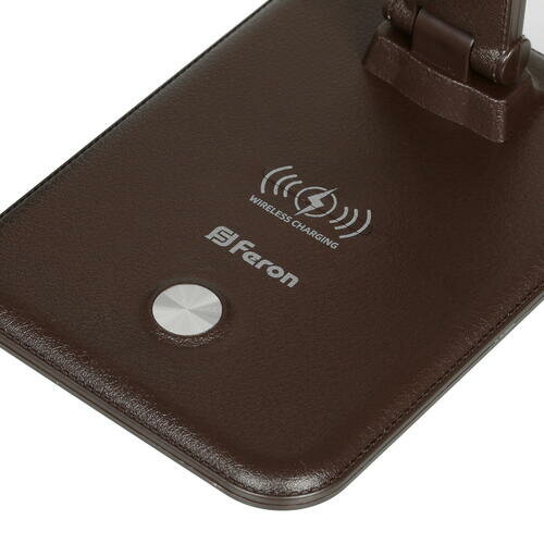 Настольный складной диммируемый светильник FERON 10W, 3000-6000К, беспроводная зарядка и USB порт, коричневый DE1728 41451
