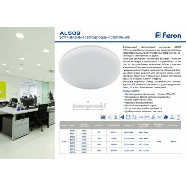 Feron св-к встр. св/д даунлайт под любое отверстие (40-90мм) 12W(1200lm) 4000K 4K 120x20 AL509 41208