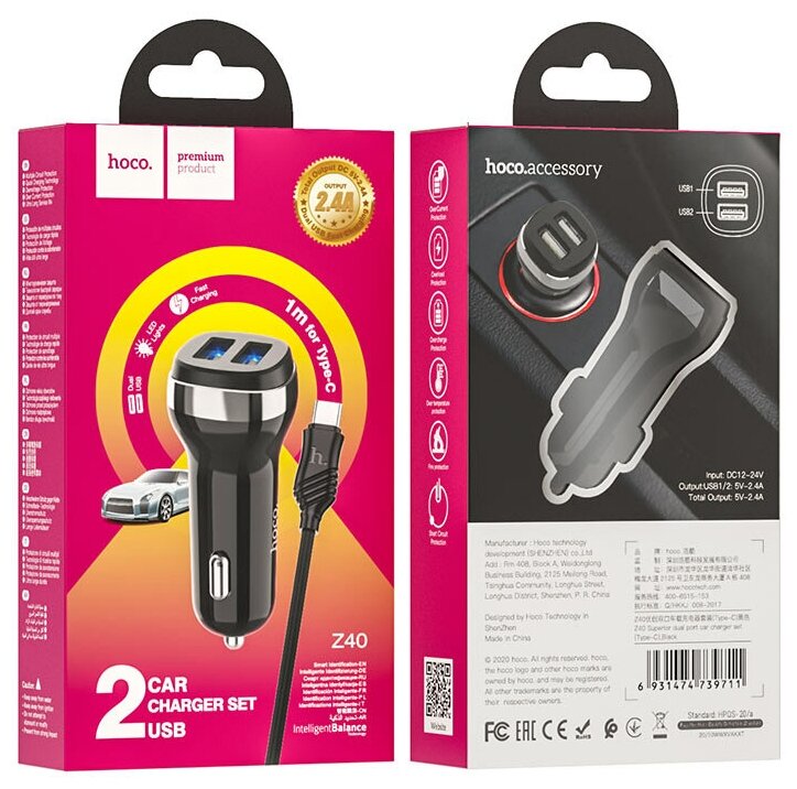 АЗУ, 2 USB 2.4A (Z40), usb cable Type-C, HOCO, черный